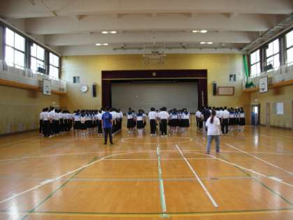 毎週水曜日は、2年生学年集会が行われる日です。学級代表がテキパキと整列・人員点呼を行っています。