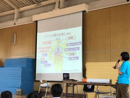 1年生は、6時限目に格技室で『喫煙防止教室』を行いました。毎年、1年生は夏休み前にこの教室を開き、正しい知識を身に付けています。講師として、都島区保健福祉センターの方に来ていただき、様々な角度から「タバコを吸うことの危険性」について、お話をしていただきました。ニコチンやタールを実際に見せてもらい、「こんな物が肺の中にたまるのか」と、驚いていました。
