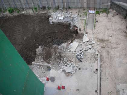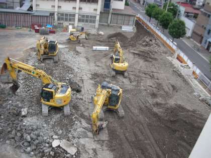 写真は、昨日の午後6時ころのものです。西館屋上から撮影しました。旧南館西の端の基礎の部分が加田少し残っています。これからはこの部分の解体が始まります。
