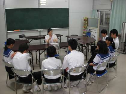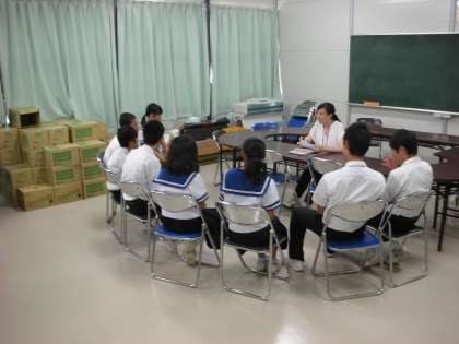 2年生の英語の授業の様子です。この日は、クラスが2つに分かれて授業をしています。少人数でスピーキングの取組をしています。先生が英語で質問し、それに対して、生徒が英語で答えるというものです。なかなか、悪戦苦闘しているようです。