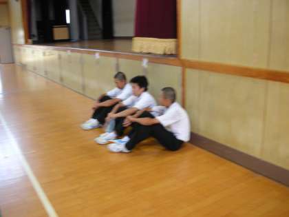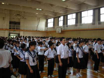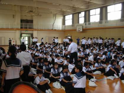 体育館で1学期の終業式を行いました。暑いので、扇風機をつけた状態で行いました。