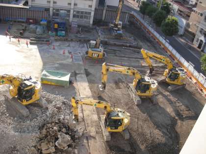 真ん中の写真は、格技室方向の写真です。重機が6台それぞれの持ち場を受け持っています。