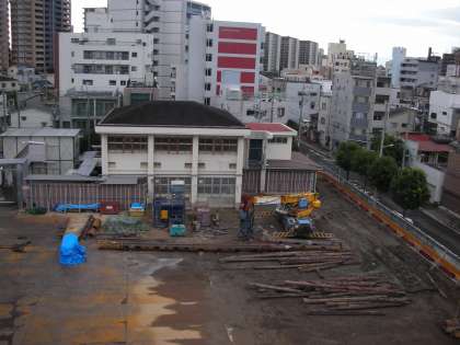 先週の金曜日に大型の重機が去りました。上の写真は、西館屋上から撮影した南東端のものです。きれいに整地されています。解体の最終段階の杭を抜く作業が粛々と行われています。しばらく、この作業が続くと思います。