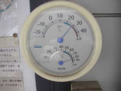 下の写真は、仮設校舎前の温度計です。気温28度2分、湿度83%です。不思議なもので、37度の慣れた体は、この気温でも涼しく感じてしまいます。環境に適応することが果たして良いことなのか、疑問に思ってしまうことも多々あります。