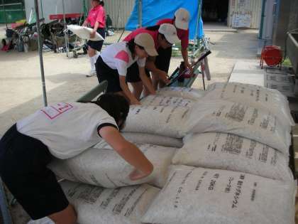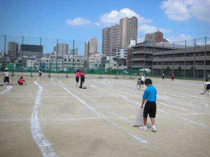 女子ソフトテニス部は、第2グラウンドで整備活動を行っています。夏の暑い日差しを受けて、乾ききっているグラウンドに、にがりをまいています。
