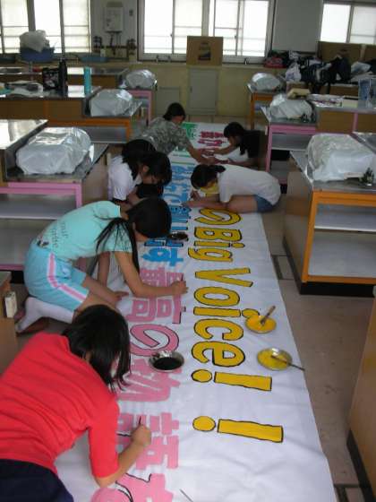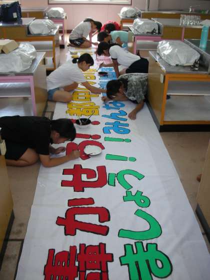 ハンドクラフト部は、本校の文化祭である六稜祭のスローガンの横断幕を作製しています。服が汚れても良いように、作業用の服を家から持ってきて作製しています。
