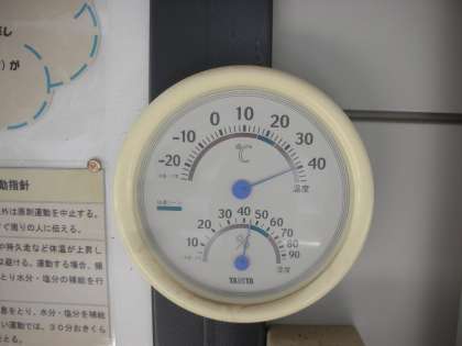 気温は39.8度、湿度は46%を示しています。温度計が設置されている場所は、日の当たらない所です。廊下の屋根が熱を受け、コンクリートの廊下やスロープにあたった陽光が反射して、温度計の値が高くなるのでしょう。本当に厳しい暑さです。