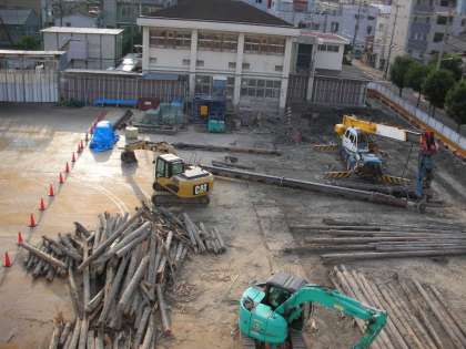 2枚目の写真は、西館4階から撮影した工事現場です。旧南館の下に埋め込まれて『杭』が引き抜かれて、きれいに並べられています。その横には、短くカットされたもの、折られたものが積まれています。これらの『杭』ももうすぐ撤去されます。
