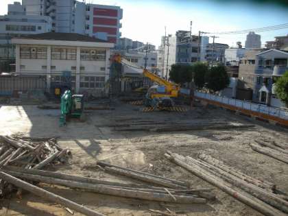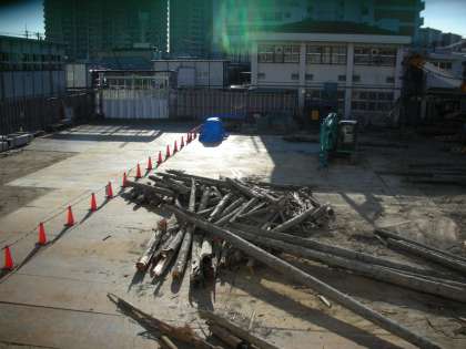さて、2枚目、3枚目の写真は、西館2階から撮影したものです。引き抜かれた『杭』が置かれています。これまでに80本ほど抜いたそうです。まだ300本ほど抜かなければなりません。天然の松の木が『杭』として、使われているそうです。このため太さが異なるものもあり、結構手間がかかるようです。また、長さが短いものは、つなぎ合わせて使われているものもあるそうです。