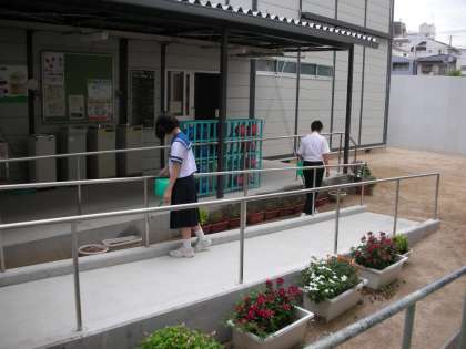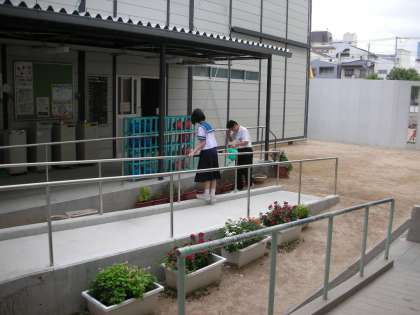 ボランティア部は、お花に水を与えるための活動をしています。この暑さです。植物たちは水を受けながら、「ありがとう!」と、言っているようです。