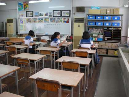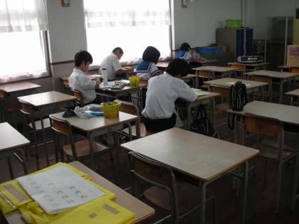 美術室を訪ねました。美術部の人たちがそれぞれの作品を描いています。そのそばで、美術科の宿題をしている生徒がいました。宿題をしている一人が「夏休みが終わりかけているので、必死に作成しています」と、応えてくれました。