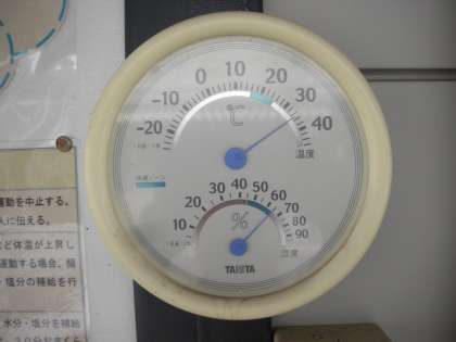 お昼12時の温度計です。気温35度、湿度65%を示しています。昼間の気温は、やはり高くなっています。