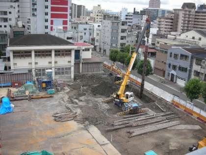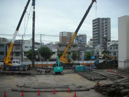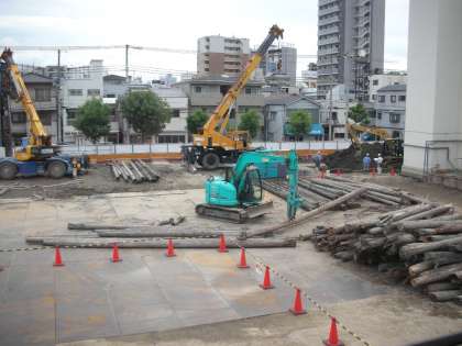 お盆休みが終わって、工事が再開しました。2つの異なるタイプの『杭』抜き機を活用して、順調に『杭』が抜かれていきます。