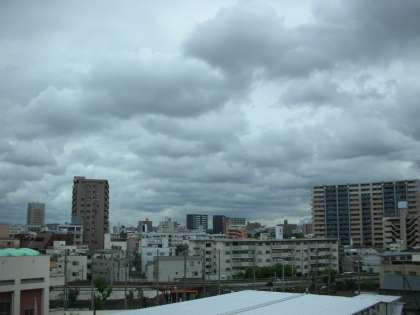 都島の上空に怪しい雲が発生しています。直ちに大雨を降らせることはないと思いますが、このような雲がもっと黒くなってきたときには要注意です。雲の形や色、風の吹き方等に気を付けましょう。