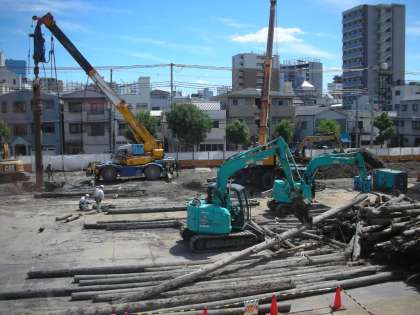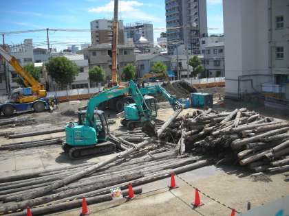 今日、新しい重機が入りました。引き抜いた『杭』を多気筒な長さに処理するための重機です。はさみのような部材を取り付けて、長い『杭』を切断していきます。太いものは、もう一台の重機との共同作業です。適当な長さに処理されたものは、近々ダンプカーで搬出されます。