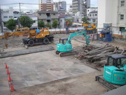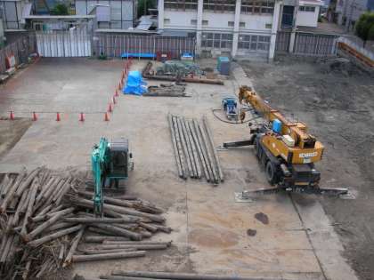 生徒の皆さんが、夏休みの間も学校では南館の工事が行われています。現在、地中に埋められている400本近い『杭』を抜く作業を行っています。今朝は、重機や機材が西側に集まっています。もうしばらくの間、この作業が続けられます。