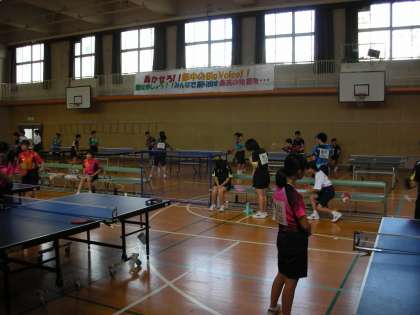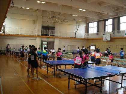 卓球部は、体育館で練習試合をしています。淀川区の美津島中学校との練習試合です。練習試合では、今まで練習してきたことを試す良い機会です。みんな頑張っています。
