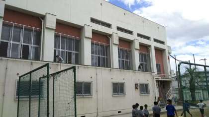 2名の管理作業員さんが、体育館倉庫の屋根の上を清掃しています。
