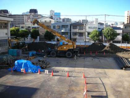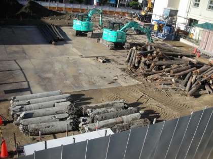 工事現場では、昨日取り出した『杭』が並べられています。職員室の真下には、コンクリート製の鉄筋が入った「電信柱」のような『杭』が並べられています。西側には、従来の松の『杭』が並べられています。