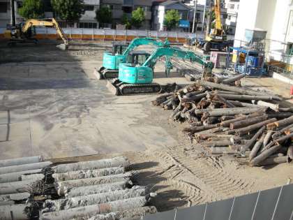 手前に鉄筋入りのコンクリートの支柱が置かれています。右には、切断された松の『杭』が置かれています。青い重機のそばには、引き抜かれたままの松の『杭』が置かれたいます。