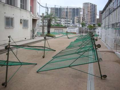 昨日は、台風20号が通過するということで、早い段階で大阪市に『暴風警報』が発令されました。学校では、暴風による被害が出ないように、テントの足を折り曲げて風の力を受けないようにしたり、防球ネットを横に倒して建物に被害が出ないようにしました。