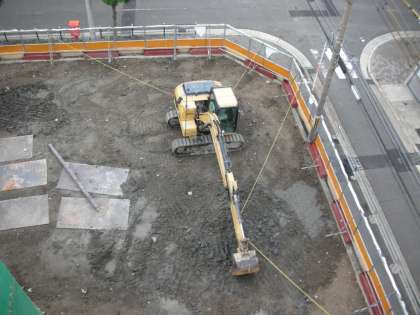 工事現場では、風圧を受けて柵が倒れないように、防護シートを巻き、風が素通りするようにされました。また、重機にロープを巻き、柵が倒れないように固定されています。おかげで、工事現場はしっかりと守られています。ありがとうございました。