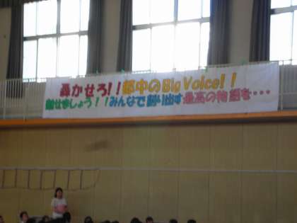 始業式の最後に、生徒会より六稜祭のスローガンが報告されました。ハンドクラフト部が夏休みに横断幕を作製してくれました。ありがとう。
