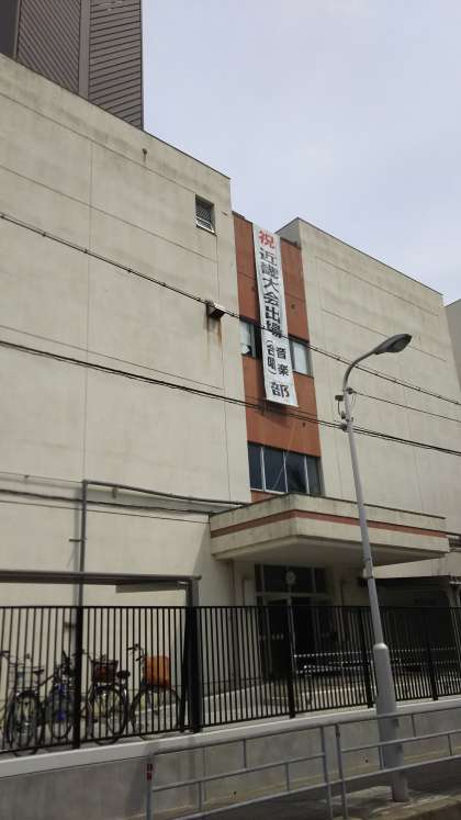 正門の上、プールの壁の部分から、音楽部が関西大会に出場することをお祝いする垂れ幕を設置しているところです。2名の管理作業員さんが、工夫しながら設置しています。「音楽部のみんなのために、頑張ります」という気持ちで頑張っています。ありがとうございます。