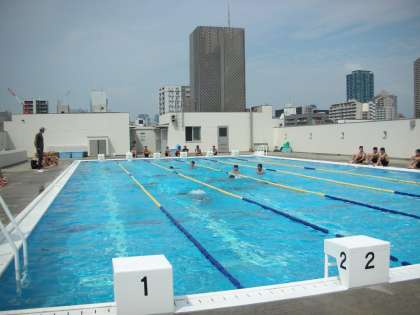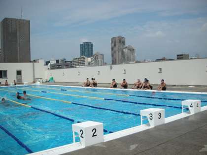 2年生の水泳の授業の様子です。水泳大会に向けて、競技の練習をしています。生徒たちの歓声が聞こえてきます。