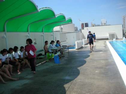 開会式の後、プールに移動。クラスごとに応援席に着席しています。
