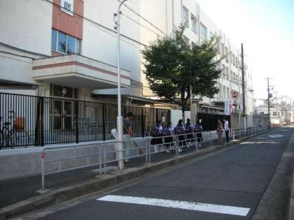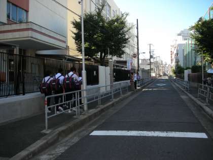 生徒たちは、多くの大人に見守られる中を登校しています。