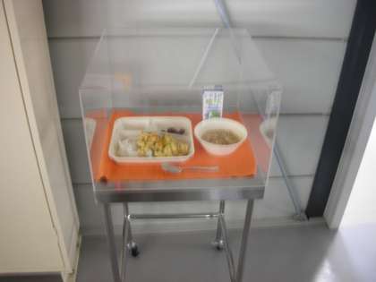 配膳室の入り口には、本日の給食の盛り付け見本が展示されています。