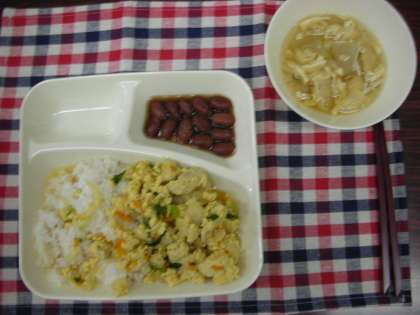 本日の給食は、親子丼、とうがんのすまし汁、金時豆の煮物でした。