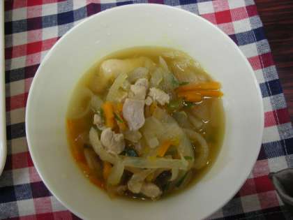 その後、給食をいただきます。あったかいご飯に、やはりあったかい親子丼の具材がかけられています。とても温かいので、おいしくいただきました。