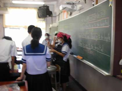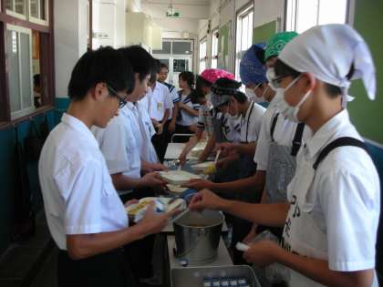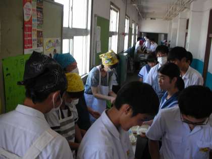 どの学年の給食当番の人は、各自が準備したエプロンを身に付けています。色とりどりで「パッ」と花が咲いたようなイメージです。