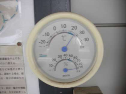 仮設校舎前の温度計は、午前7時現在、気温26度、湿度95%を示しています。蒸し暑さを感じます。
