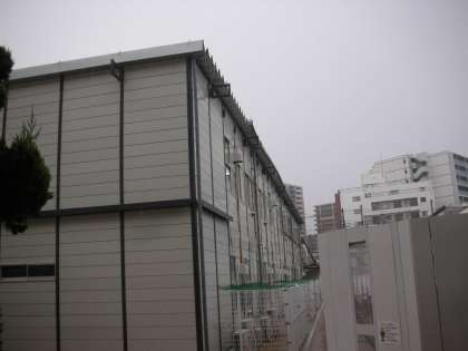 仮設校舎の雨樋が、台風21号の強風により、破損しました。雨が降っているので、屋根から「バタバタ」と、地面に雨が落ちてきます。仮設校舎の会社に修理は、依頼しています。もう少し、お待ちください。