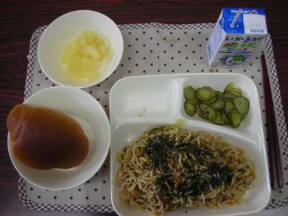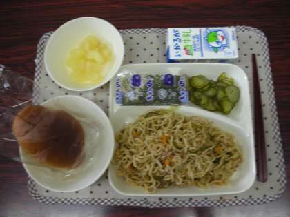 本日は、焼きそば、きゅうりの甘酢づけ、洋ナシ、パン、牛乳でした。