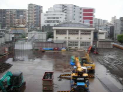 上の写真は、西館3階から東方向を撮影したものです。雨が降っているので、暗い感じがします。工事現場では、昨日から降り続いている雨のため、水たまりができています。
