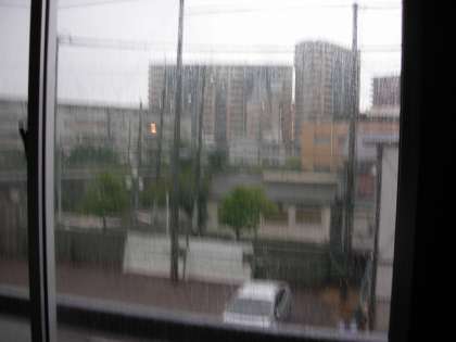 下の写真は、仮設校舎2階から東側の窓を撮影したものです。東から雨が降っていることがわかります。窓を開けることはできません。
