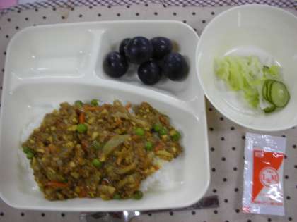 今日は、大豆入りキーマカレー(米粉)、グリーンサラダ(ノンエッグドレッシング)、ぶどう(巨峰)、米飯、牛乳でした。