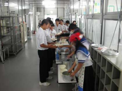 エプロンを着て、三角巾を着け、手を石鹸で洗い、次にアルコール消毒をします。これで準備完了。食器や食缶を取りに行きます。