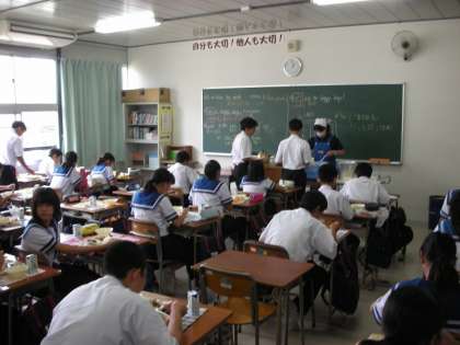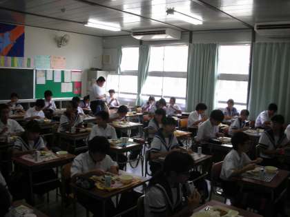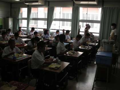 先生も生徒もエプロンと三角巾を身に付け、マスクをして給食の準備をします。楽しそうに見えます。食事中もとても和やかな雰囲気です。