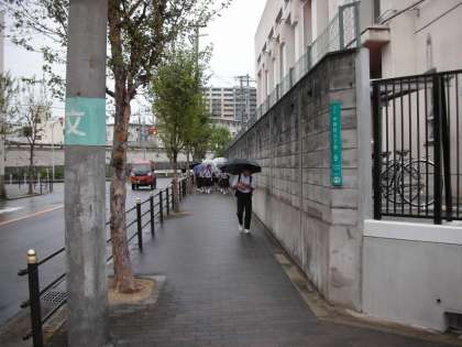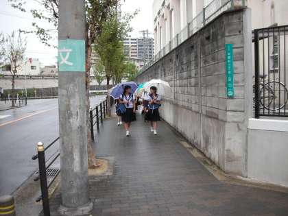 今日は、しとしと雨が降っています。生徒たちは、傘をさして登校しています。
