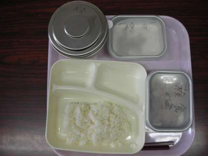 これは、改善員さんが校長室に運んでくださった『検食』です。生徒の皆さんが食べる前に、私たちが先に食べて、安全かどうかを確かめる作業を行います。