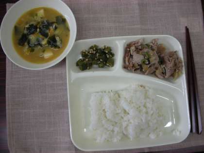 今日のメニューは、豚肉の甘辛焼き、味噌汁、オクラのおかかいため、米飯、牛乳でした。とてもおいしい給食です。味噌汁は、具だくさんで、とてもおいしかったです。生徒の反応はどうでしょうか。