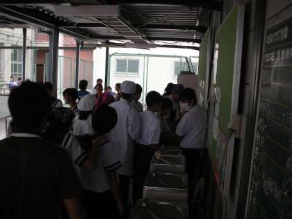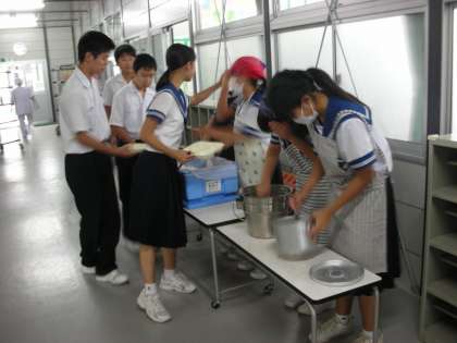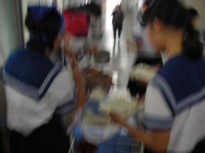 給食当番の人が、給仕をしてくれます。当番以外の人は、食器を持って、並びます。