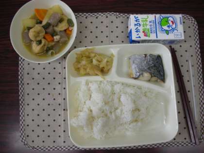 本日の給食は、さごしの塩焼き、じゃがいもと一口がんもの煮物、キャベツのおひたし、米飯、牛乳でした。