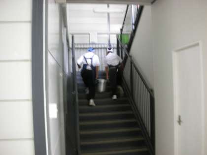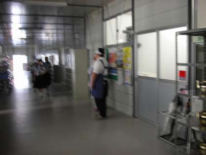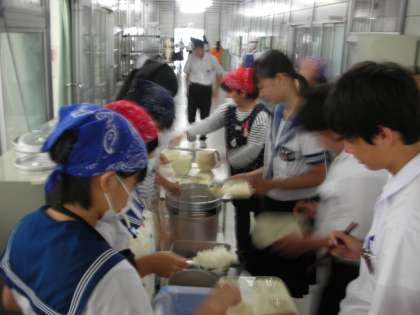 給食の時間前に先生と配膳員さんが、食缶等をのせたワゴンの前で給食当番の到着を待っています。