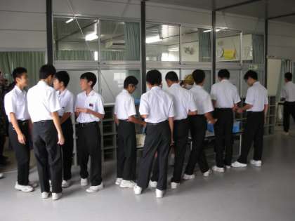 給食当番がワゴンの前に並び順番におかずを入れていきます。